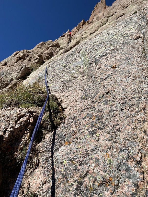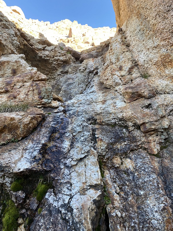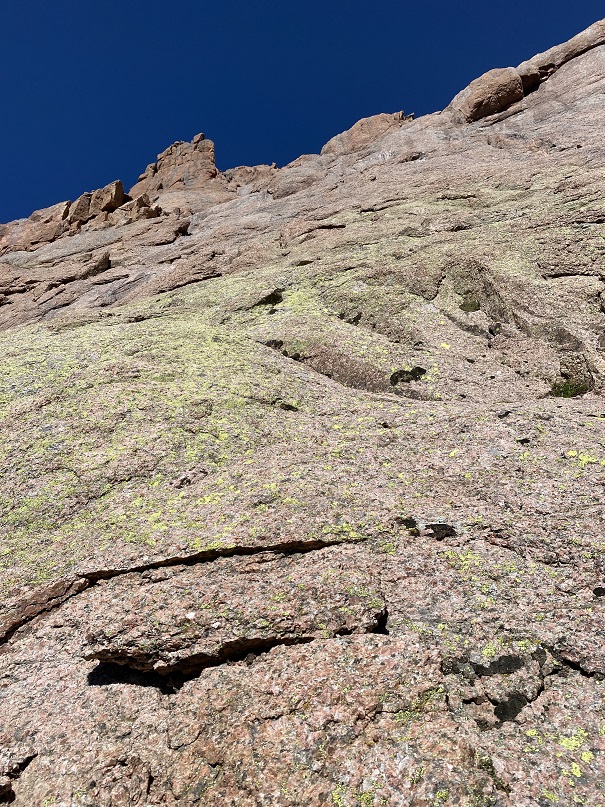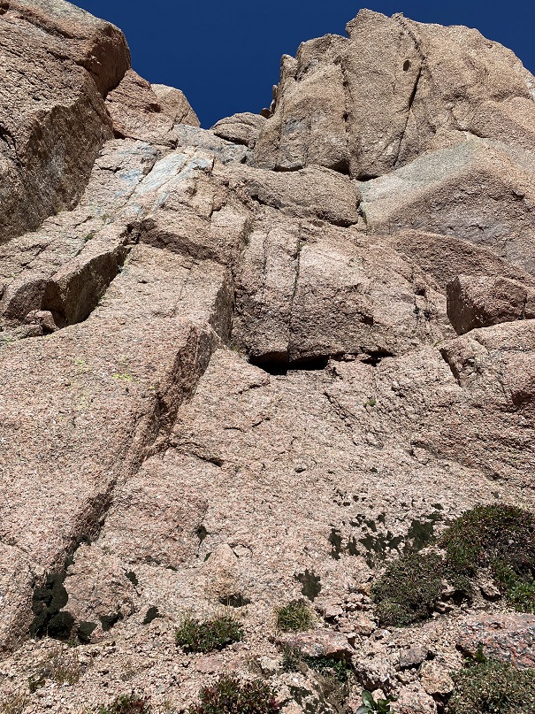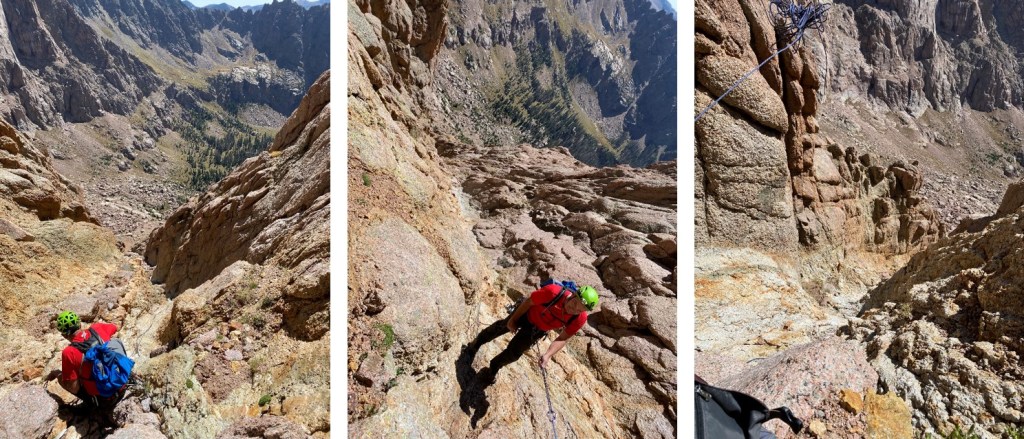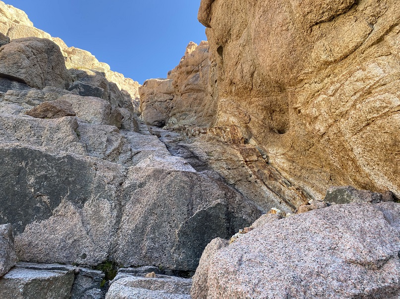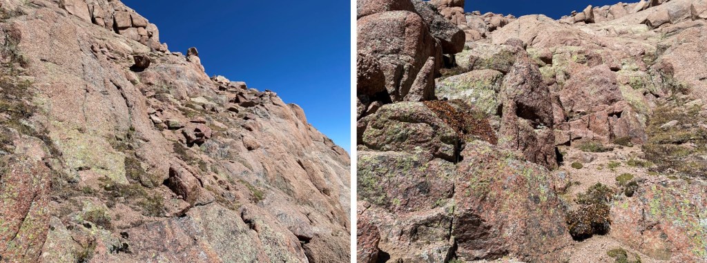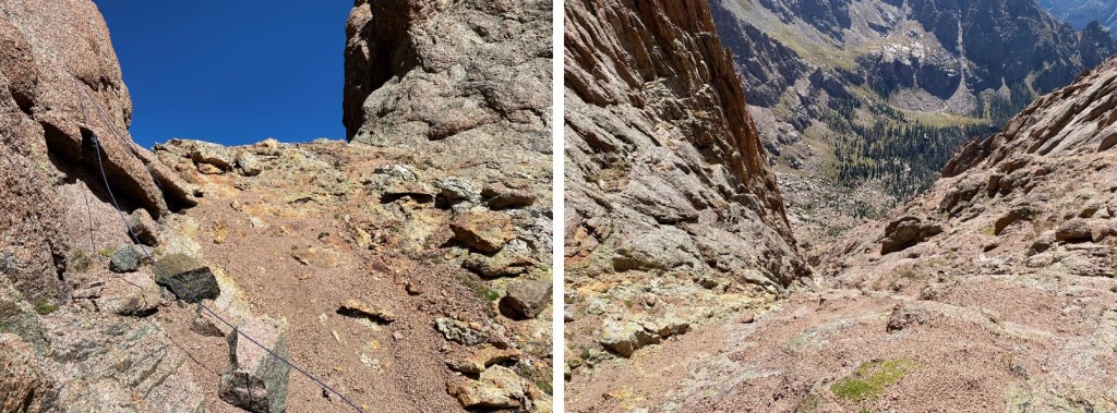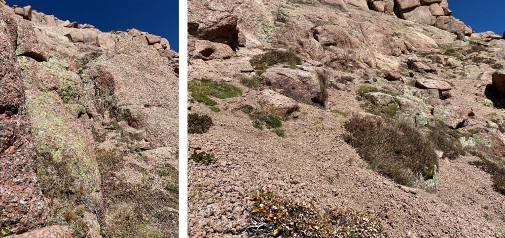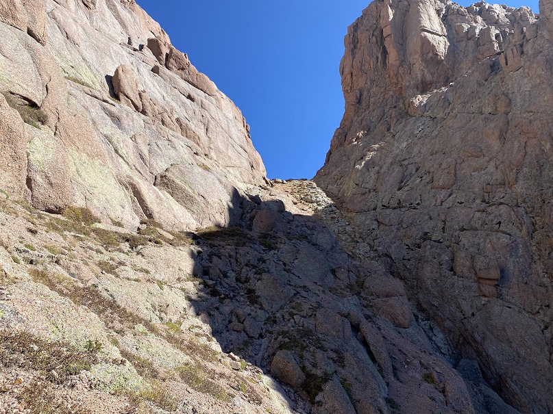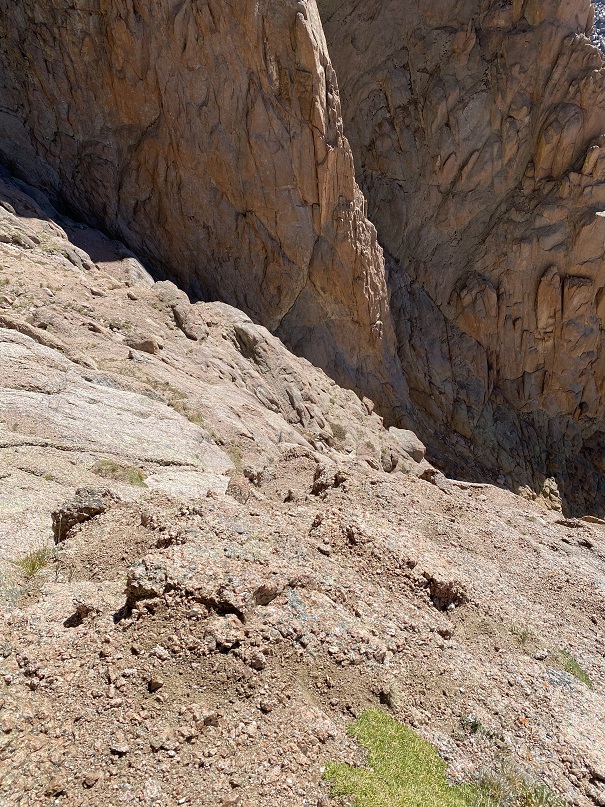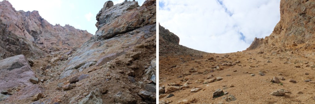 Here’s where I made another mistake. I tried to take a route to the left first, by following a dry couloir and what looked like a line filled with tundra/dirt. This was a bad idea. It started out as class 3, then sustained class 4 (for about 300’). I quickly felt out of my depth as it increased to class 5. I had a helmet, but seriously felt I needed a rope. I got to a place where it was decision time, and decided to descend those 300’ and try a different route. I knew I was close to the ridge, but could not justify the exposure and class difficulty. I reminded myself I had 3 potential routes for this peak, and an event I was speaking at tomorrow talking about managing risk and being a positive mentor to Girl Scouts. I did not feel I could continue on and still remain truthful tomorrow, so I backtracked. Climbing down was much more difficult than climbing up: I had to face the mountain and take it one step at a time. This entire side was sketchy. Please don’t use this route, especially since the gully can be kept at 2+. Here are some pictures of the route you SHOULD NOT TAKE