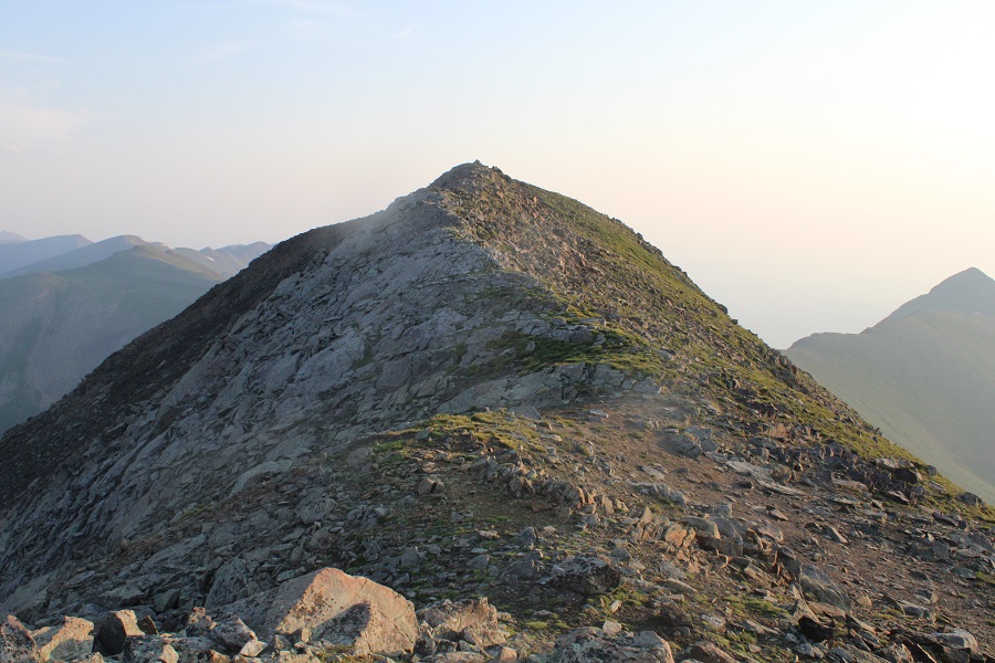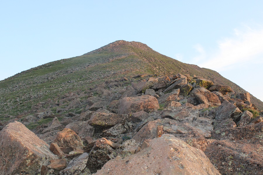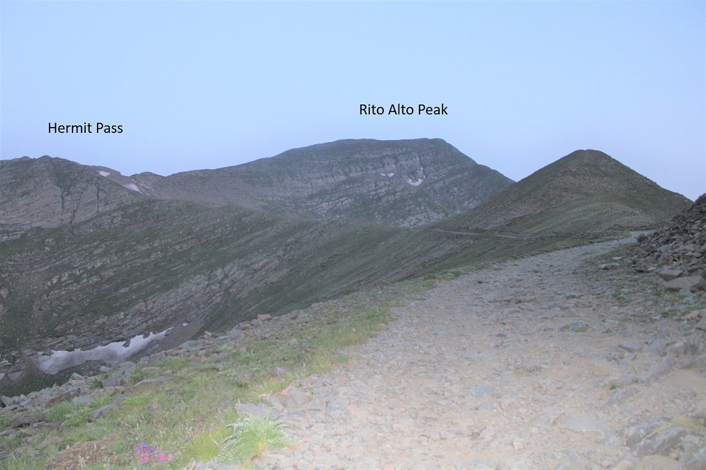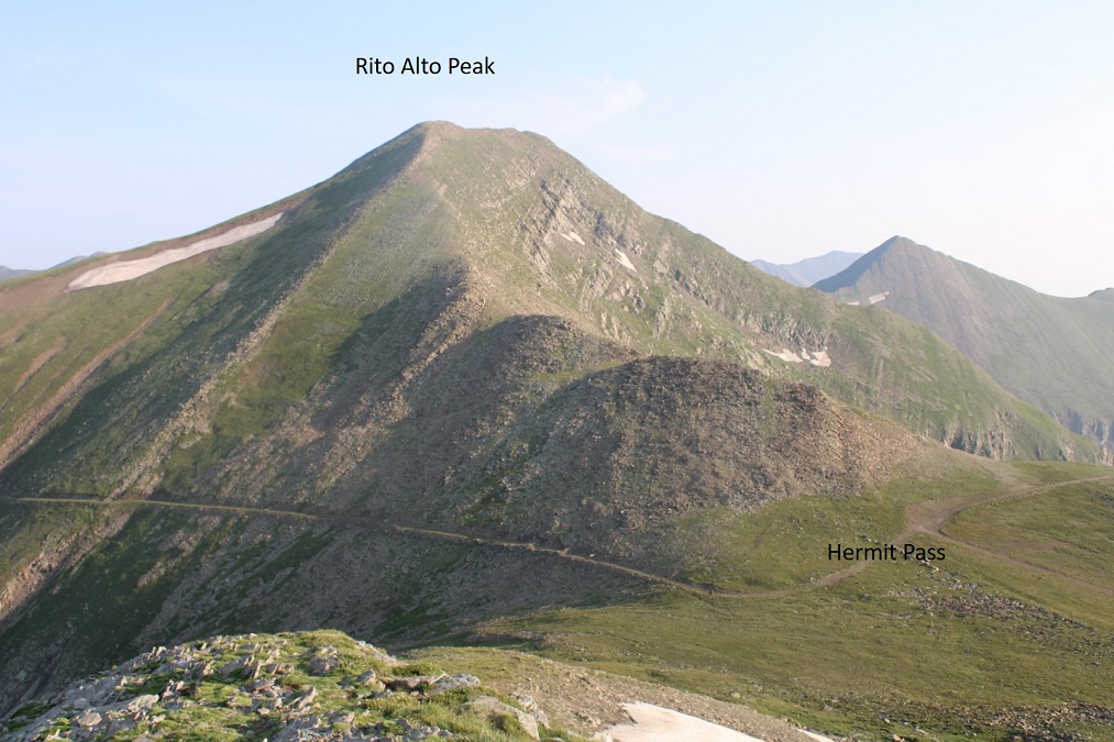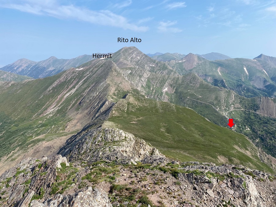 I made it to Hermit Pass, turned right, and followed the ridge northeast to the summit of Rito Alto Peak. This ridge has a lot of large rocks, mixed with tundra. The rocks have the Crestone-grip and most don’t roll.
