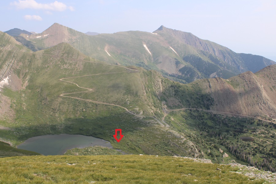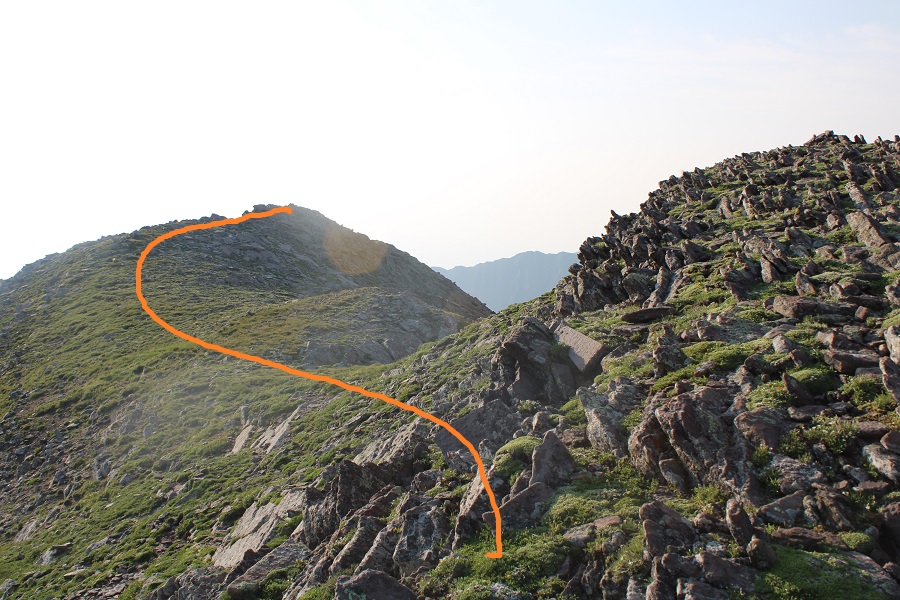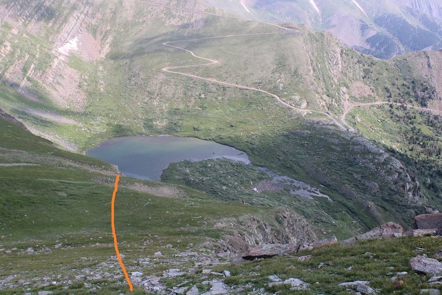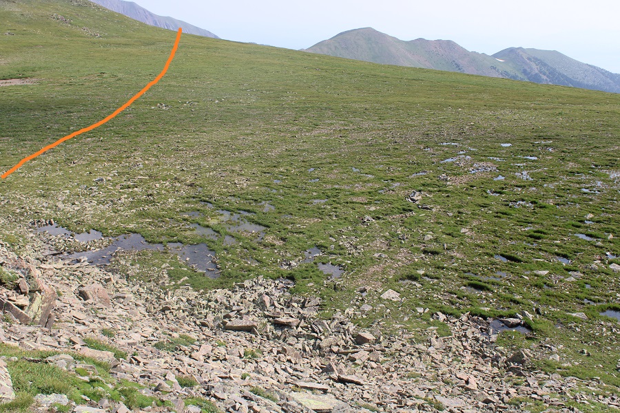 Once you see the change from tundra to rocks, notice the top of this gully. It will be the decent route.