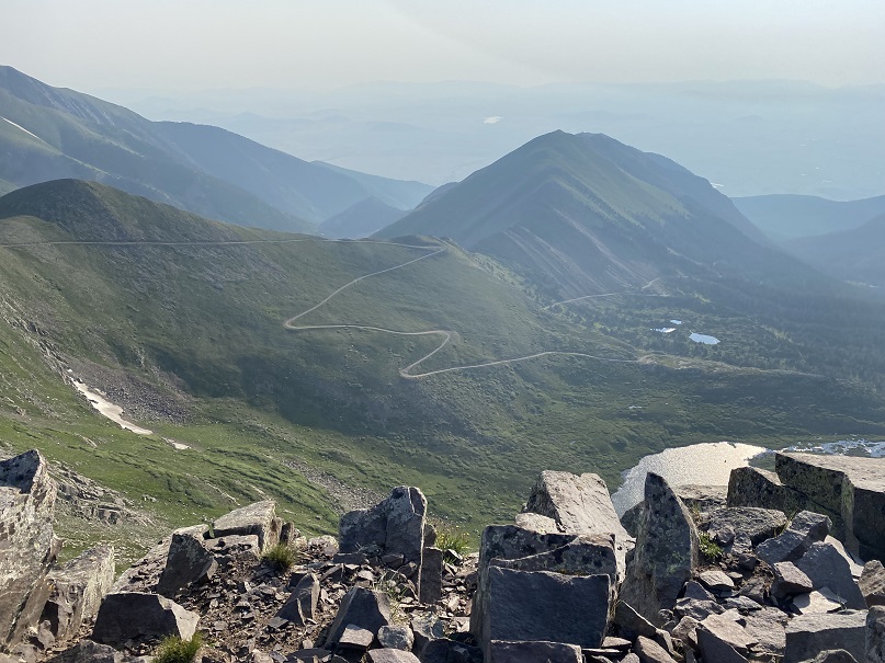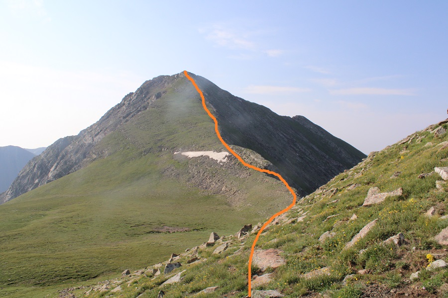 The hike is a tundra/rock ridge hike until the last 20 feet or so. Here’s the route I took, staying above the snow but below a rock formation on the ridge. You could also just go straight up the south face.