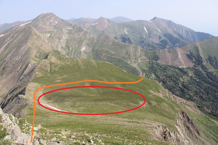 Now to head over to Houghton. This was mostly a class 2 ridge hike through rocky, rolling tundra, littered with a bunch of mines. It was also choose your own adventure on a wide ridge. I was aiming for where the orange arrow is pointing.