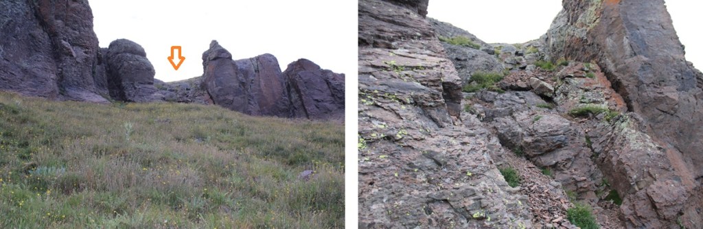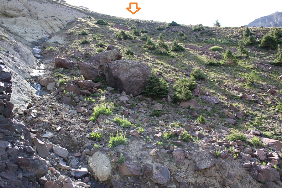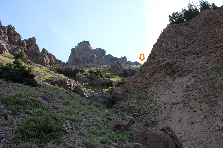 This next part is difficult to explain. You’re going to WANT to head straight up to the rock formation in front of you, but don’t do that. Instead, continue following the drainage, but aim to the right of the rock formation.