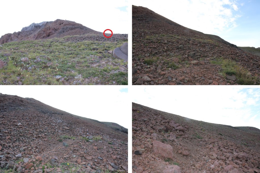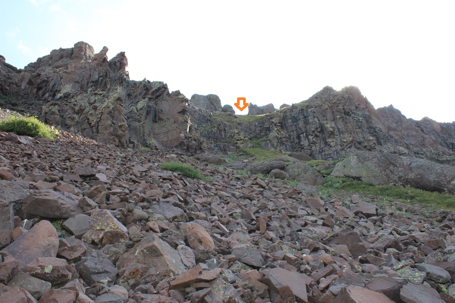 At 12700’, just before the rock formations directly in front of the trail, I left the trail and headed northeast for the ridge once again, this time on scree.