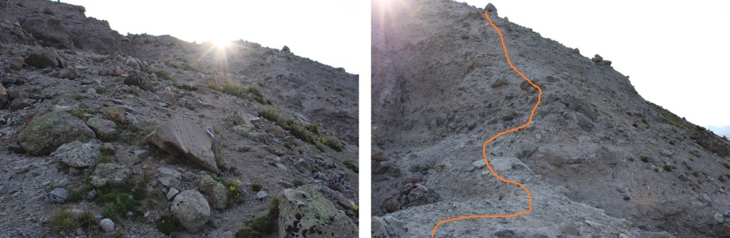 Back on the ridge, I followed it east towards the summit. The terrain here became slippery. Rocks the size of softballs and footballs were held together by dirt, and that’s what I was walking on. There were steep runnels on either side of the trail, which at times was less than 2 feet wide. A slip would have been dangerous here, on either side. This was all class 2, but I’d advise wearing microspikes for traction.