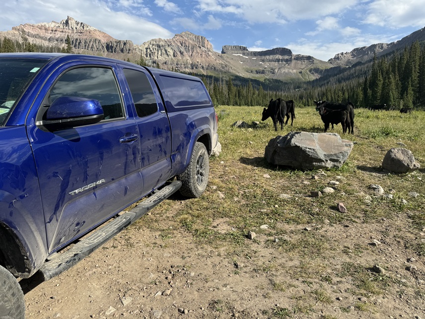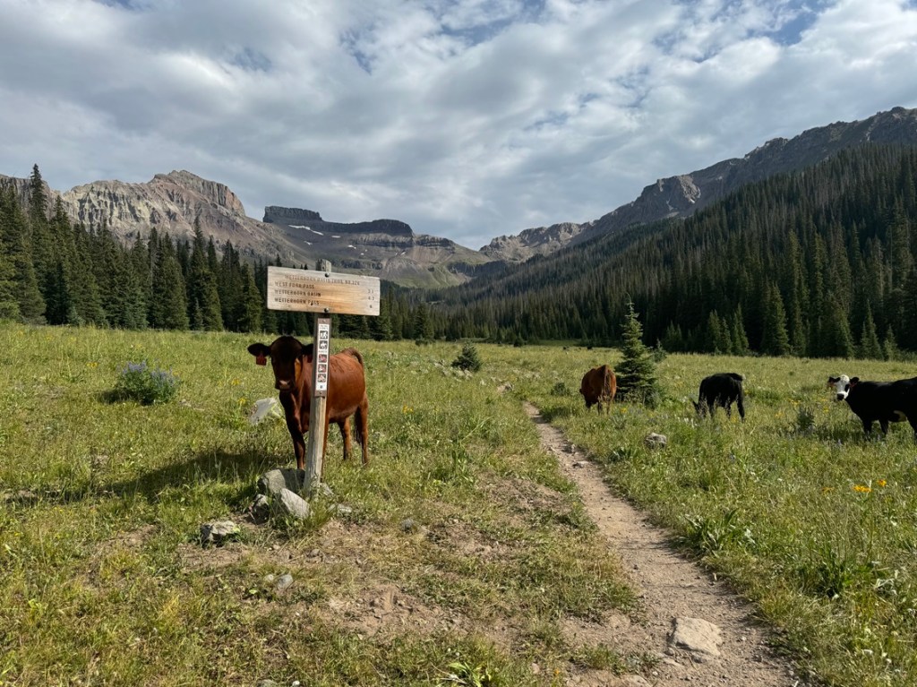 I parked at the Wetterhorn Basin Trailhead, and was greeted to a herd of cows. They were all over the basin, and would be my companions for the next few days. They had a penchant for licking my truck. The drive in is 2WD on a dirt road until 2 miles before the trailhead, where it becomes 4WD and requires clearance. None of these pictures are as clear as I’d like. The fires weren’t helping in the morning, and the sun wasn’t helping with shadows in the early afternoon. I know not to head east early in the morning, but I did it anyway. Sorry!