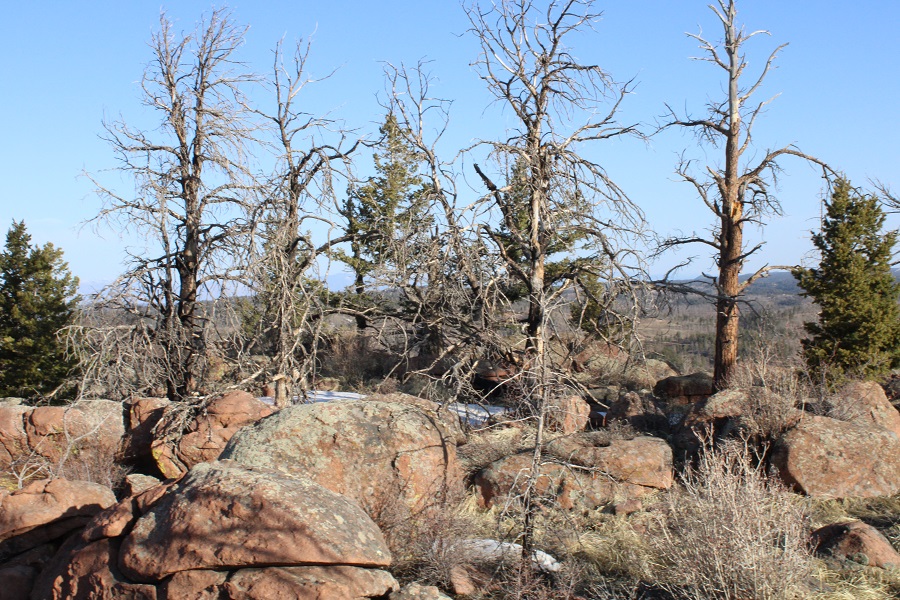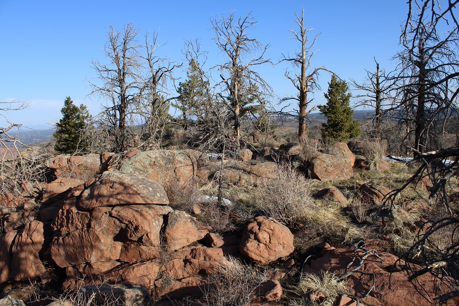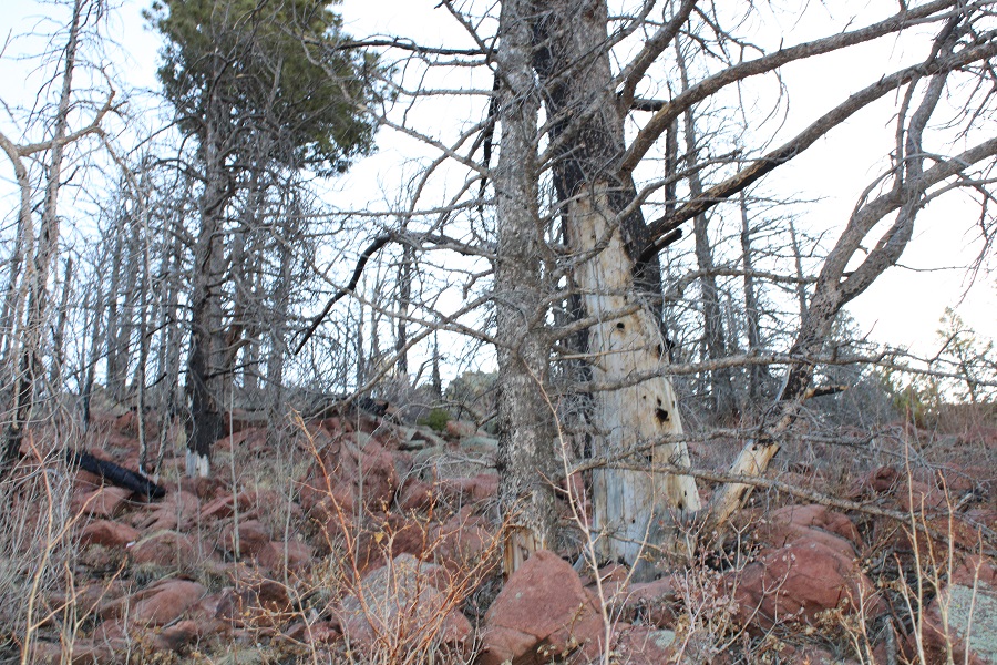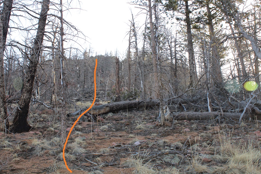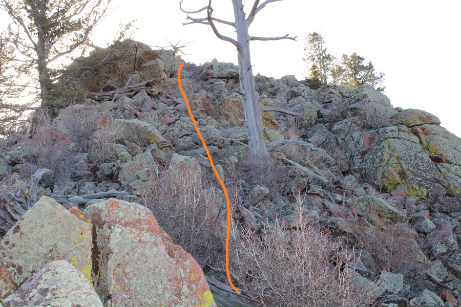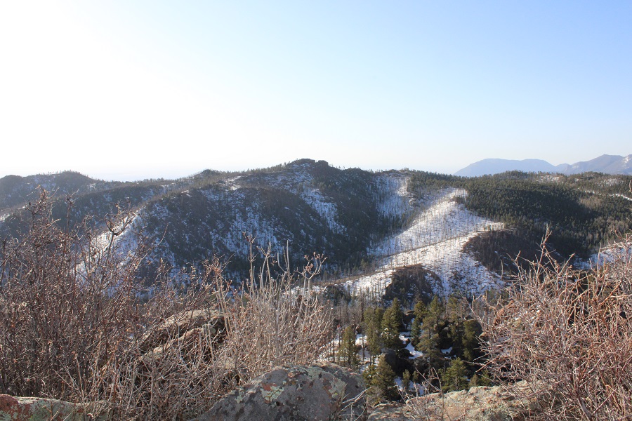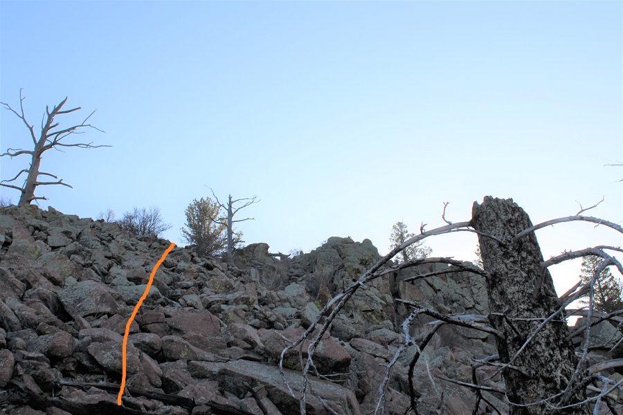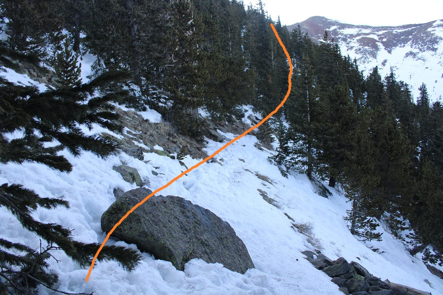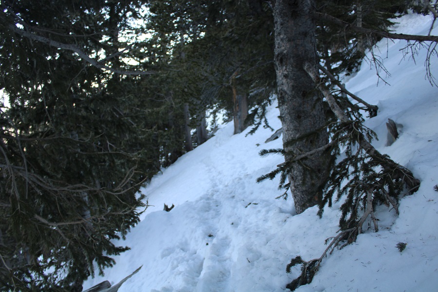 Once in the trees there was a lot of snow, so I had a hard time following the trail. There were several downed trees covering the trail, and a lot of social trails. If you’re doing this peak in summer it will be a straightforward, class 1 trail. If you’re doing it with snow on the ground expect some route-finding. I switchbacked northeast to the saddle. The saddle you’re aiming for is the one that’s directly east of you from the parking area (it’s a clear, skiable path).