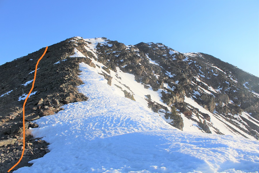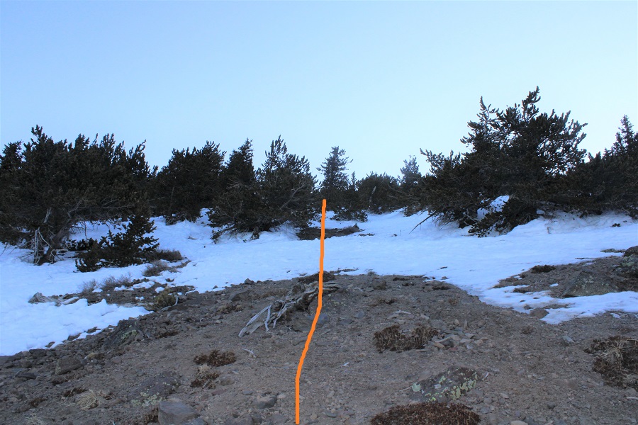 As I neared treeline the snow declined and there was no longer a trail. I kept heading northeast to the saddle