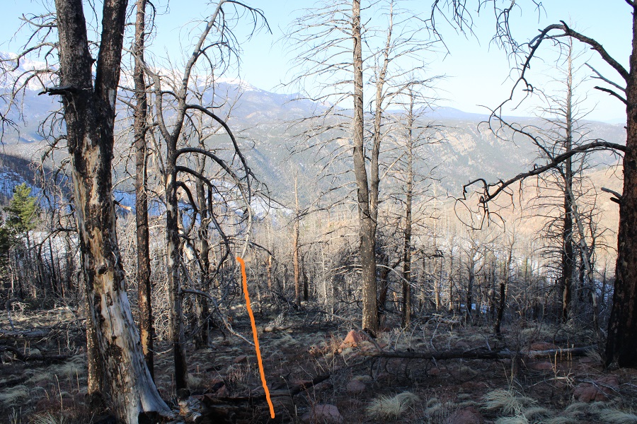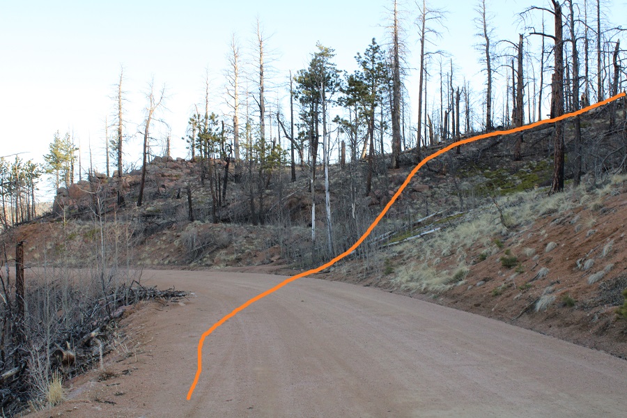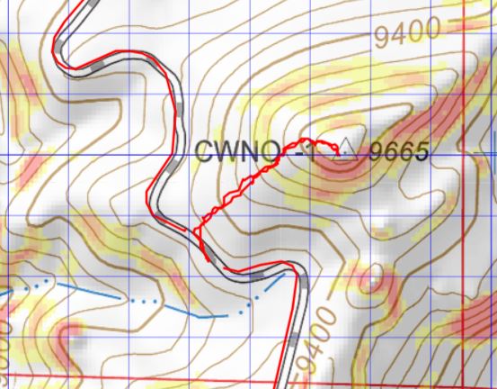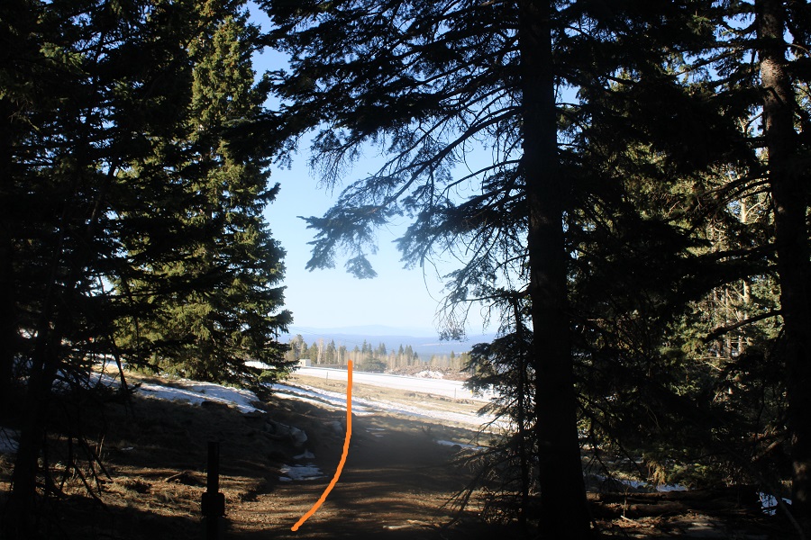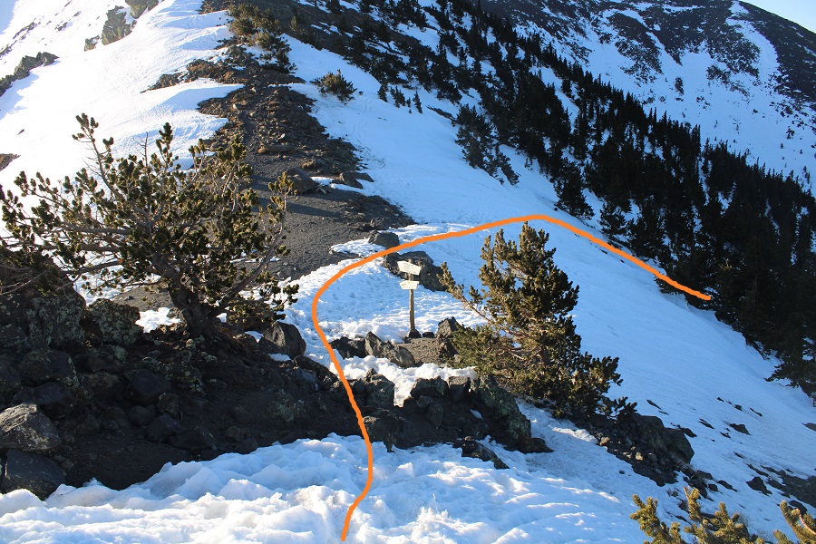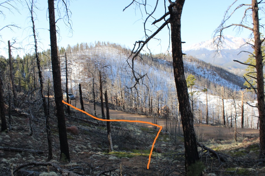 Taken from the saddle, the parking area is circled. Here you can see it’s a straight shot west from the saddle, but that area was all skiable and off limits, so I did my best to switchback down the mountainside, following the summer trail.