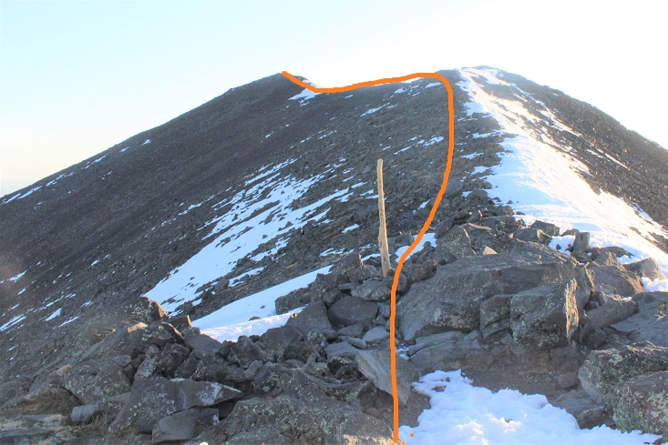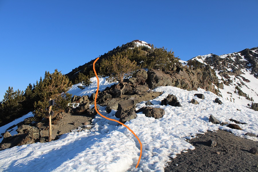Once at the saddle I turned left, and followed the ridge north. (Going right will take you to Agassiz Peak) There’s a faint trail here that picks up as you go along, as well as wooden posts to guide the way. Stay to the left while on the ridge.