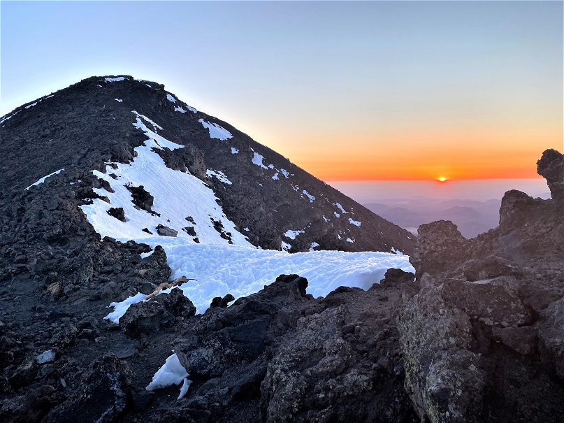 I sat in the back of my truck and started making dinner. A young man pulled up with a similar set-up and got out to enjoy the sunset. He spent his time sitting in a chair enjoying a beer, alternating drinking with doing push-ups. I went over and talked with him for a bit, and we ended up doing a few whiskey shots together (both of us had various bottles in our rigs). He was a nice young man (reminded me of my son) and this was his third time this week at the trailhead. He hoped to summit the next day as well. After the sunset I wished him good luck and told him I’d see him tomorrow on the trail (either up or down).
