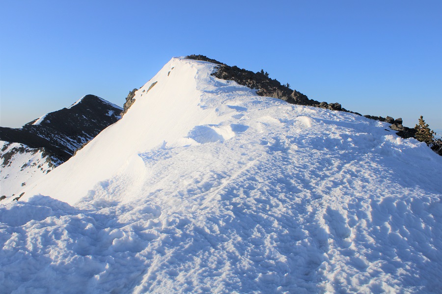 The girl I’d been leapfrogging with took a different route up (there were several snowshoe tracks to follow), and when we hit the ridge she got out a sleeping bag and decided to watch the sunrise. She never did go to the summit, and was gone when I made my way back down.