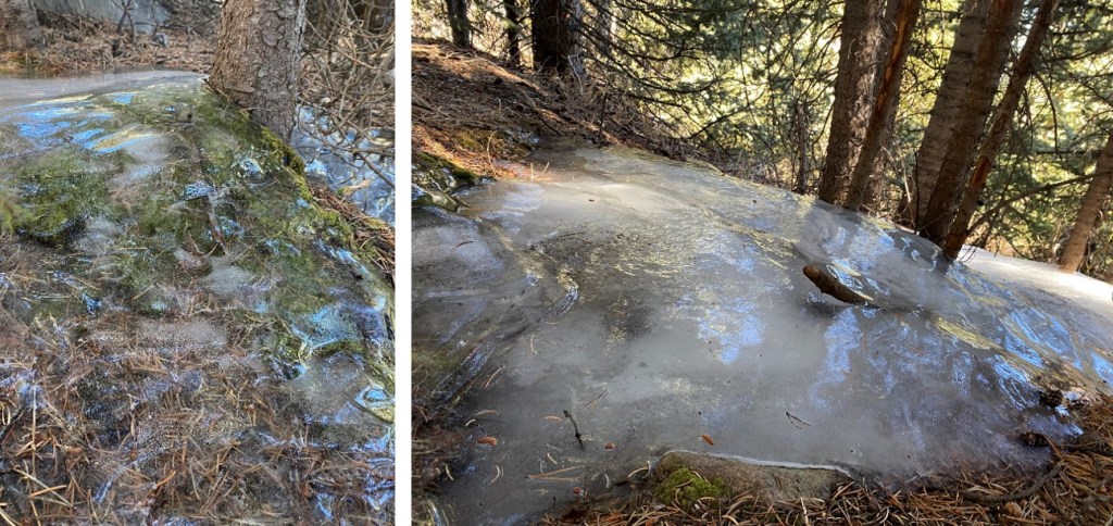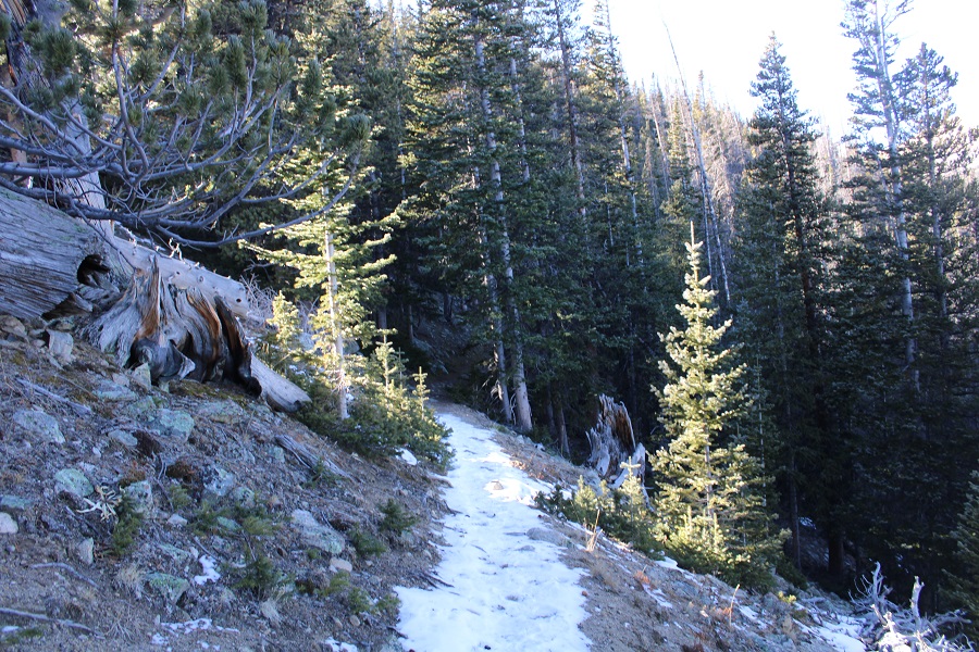 There’s surprisingly little snow for this time of year, but it’s still cold outside. There were several areas of frozen water below treeline that looked really cool.