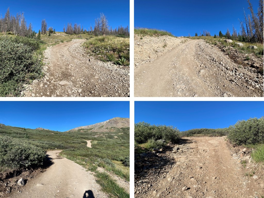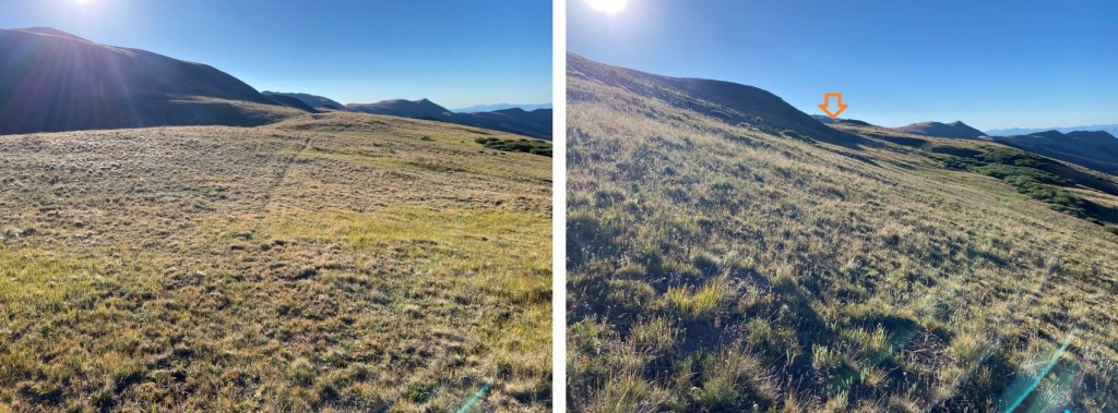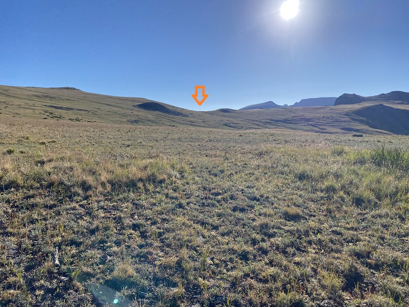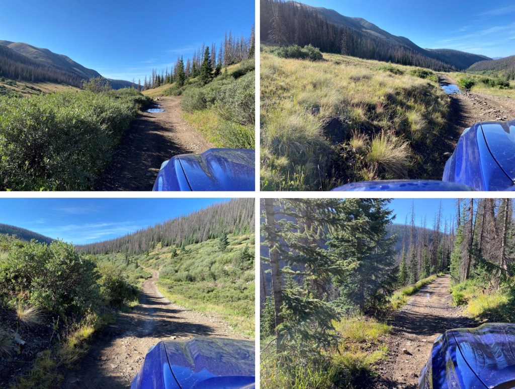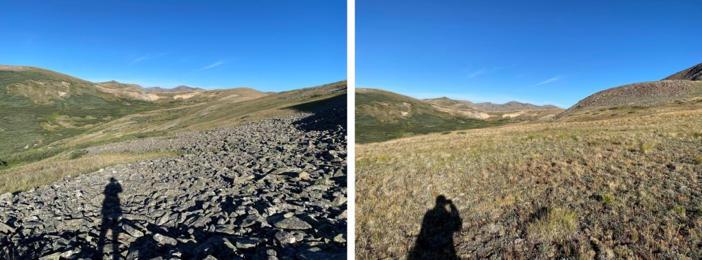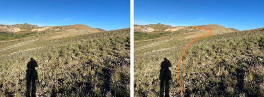 And some step-by-step pictures. Once I was on the ridge there was a faint game trail to follow much of the way back to the road.  Unlike you’ll see on CalTopo, there is no road here. I stayed above the willows but below the rock rubble.