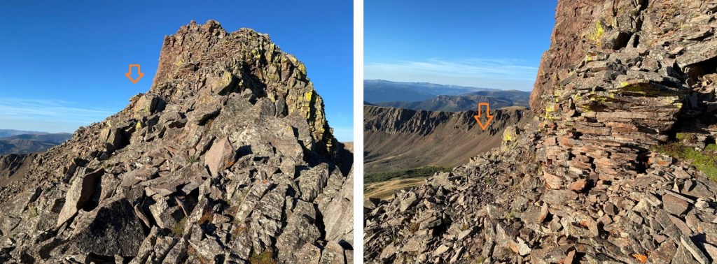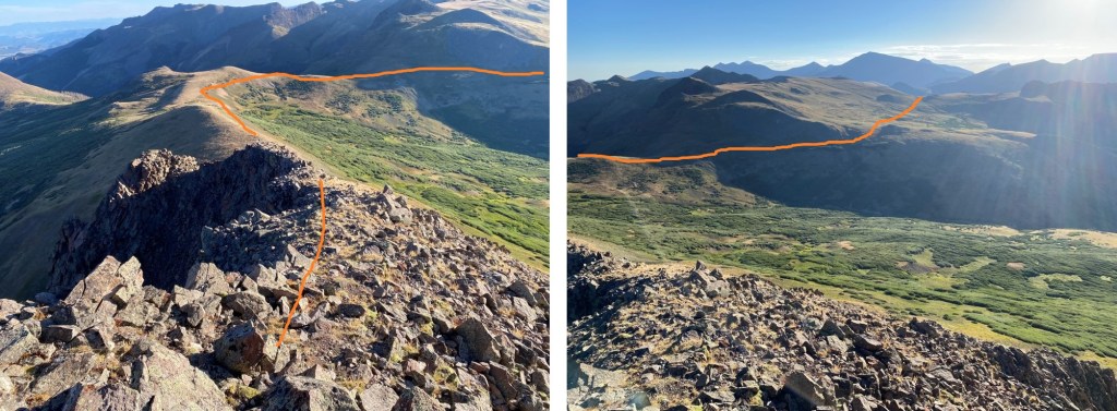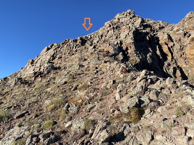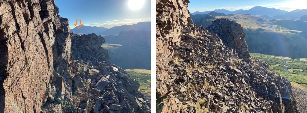 On the ridge at 12,900’ I hit a snag, and realized I needed to drop down where I saw this gully.  Directly below it I saw a cairn and headed that way.  Here’s a visual of where you should go when you hit this area.  Head down, not up, and continue around the left side.
