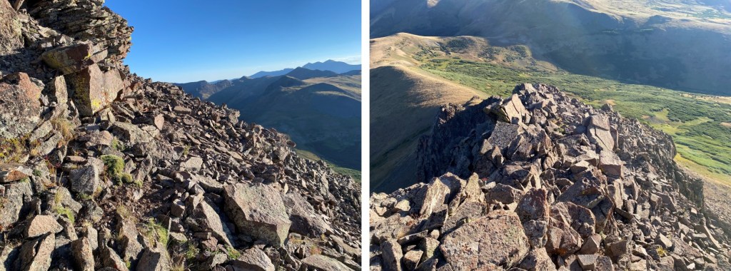 If you don’t already have your helmet on now is the time to do so.  There are several routes up this ridge.  I took the ridge proper at class 3 all the way to 12900’ before dipping down and south, then traversing around the east side of the mountain to get to the summit (lots of cairns to help once I dipped down).  However, you don’t need to take the ridge proper to this point.  If you stay to the left of the ridge there are game trails that keep you about 50 feet below the ridge on class 2 terrain most of the way.  Here are the routes: