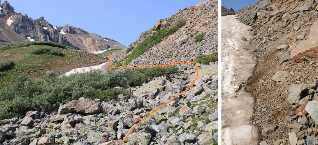 After gaining the ridge I actually moved from the south side and traversed the north side of El Diente. The north side had some snow directly on the route, but it was easily navigable.  Here’s a picture looking back at the north side part of the trail and also of the traverse.