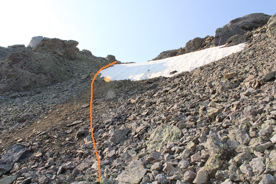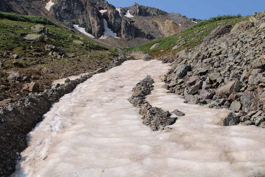 There are two ways to top out of the gully.  I took the first one up, the last one down.  If I were to do this again, I’d take the one closest to the top up and down, as it felt more secure.  Here’s the one I took up, which still had snow in mid-July: