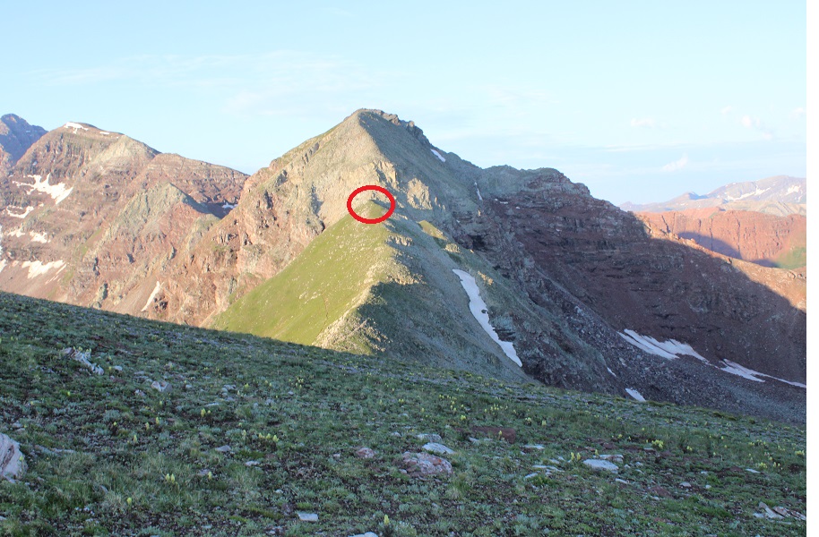 I aimed south, towards what looked like the ridge, but went too far up, where the route cliffed out.  Instead, head east.  At around 13190 there’s a path to go around the mountain. I had to descend about 50’