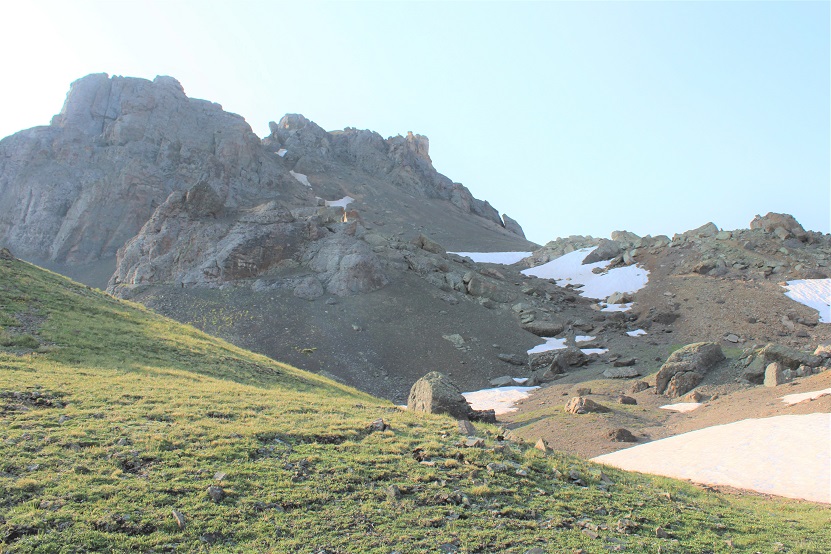 From my parking spot at Stony Pass I was on the trail at 6:30am, following the 4WD road west until the tundra met the rocks, and I was able to find a game trail that picked up on the other side.  This trail starts out difficult to find, then becomes a solid trail for most of the hike.  Here’s what the route looks like from below: